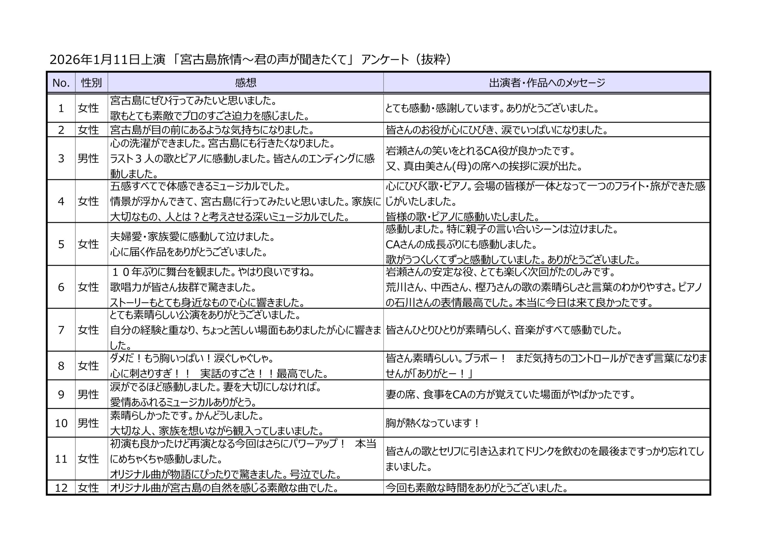 公演後のアンケート(抜粋)